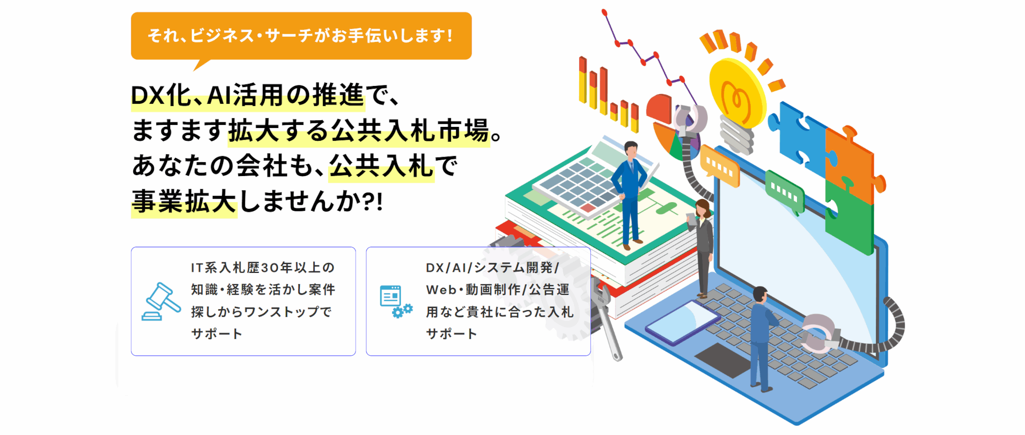 また、コンサルテイングもDXやAI入札を中心に数多くの実績を持っており、クライアント様より厚い信頼を寄せていただいております。