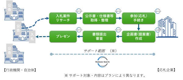 私たちビジネス・サーチは、「入札は初めて...」という企業様、「(希望の)案件が見つけられない...」「なかなか落札できない...」という企業様にも安心して入札に参加していただけるように、入札案件のリサーチ/紹介、そして入札(入札前の審査)までに必要作業をサポートします。